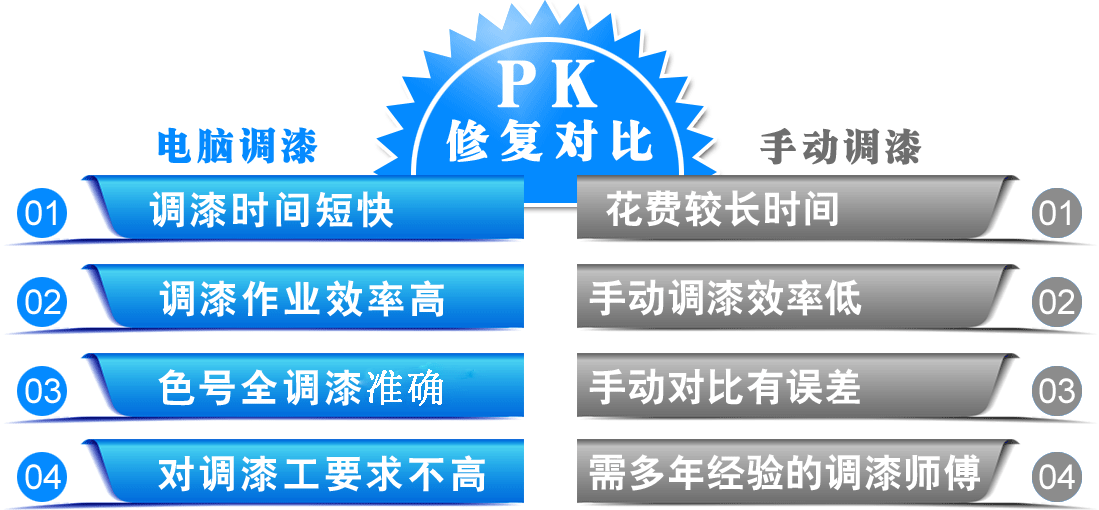 電腦調漆彌補了汽修店調漆技師經驗及手法的不足之處,加快了調漆的速度和調漆的準確性,確保了調漆與車漆色號的一致性,大大提高了調漆的速度,同時提高了作業效率,是現代化汽修項目的趨勢。