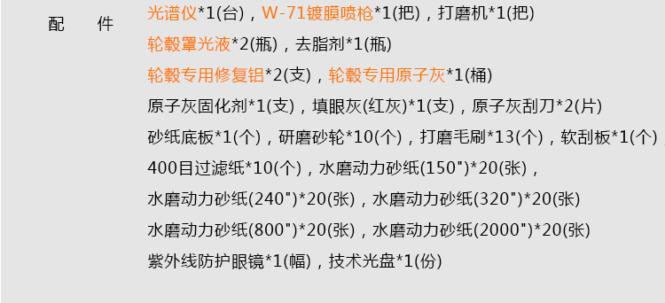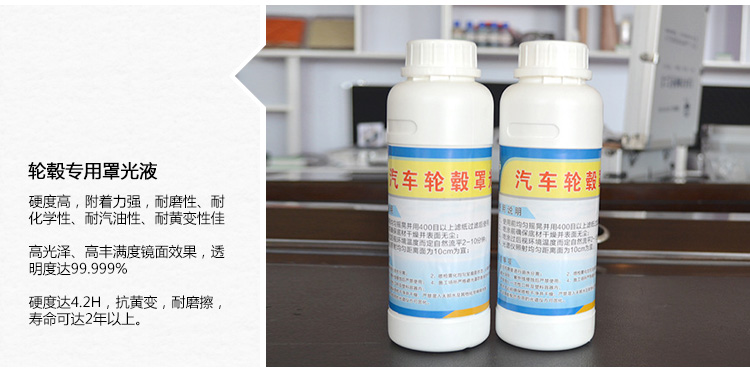 | LG-011 | 輪轂罩光液 | 采用輪轂專用罩光液,硬度高,附著力強,耐磨性、耐化學性、耐汽油性、耐黃變性佳,高光澤、高豐滿度鏡面效果,透明度達99.999%。硬度達4.2H,抗黃變,耐磨擦,壽命可達2年以上。 | 2(瓶) | ![]() |