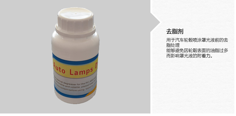 | LG-012 | 去脂劑 | 用于汽車輪轂噴涂罩光液前的去脂處理,能夠避免因輪轂表面的油脂過多而影響罩光液的附著力。 | 1(瓶) | ![]() |