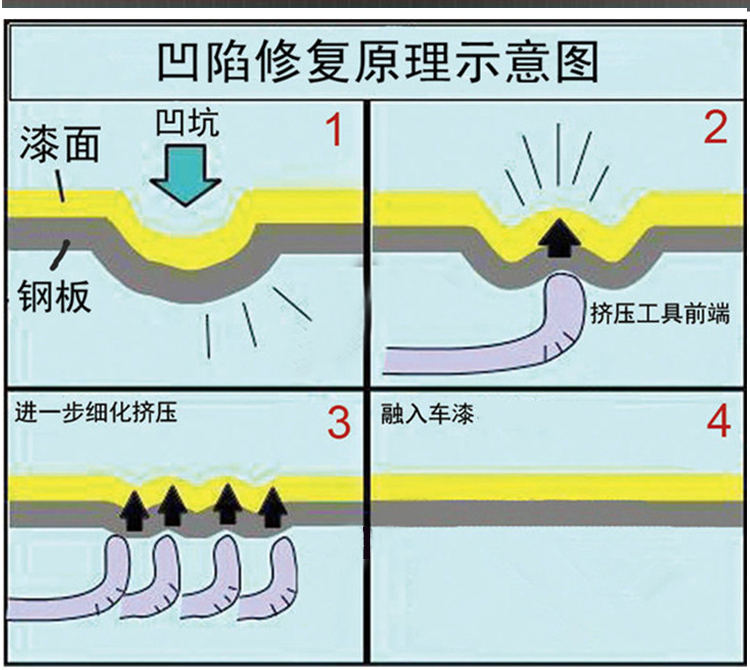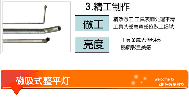 汽車凹陷修復工具主要的要有圓潤度并且柔韌度大于硬度才能讓修復輕松自如,才能合理的利用杠桿原理,但是做到這幾點需要專用的生產工藝和特殊的材質才能達到滿意的效果,市面的仿制品都是手工研磨,所以 給使用者制造了很大的使用難度或直接沒法正常使用,我公司引進日本先進的冷壓生產工藝,國內一家凹陷修復工具配有專用拉拔器,設備盡顯細節,能夠達到不錯的修復效果。