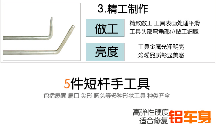 專用型免噴漆凹陷修復工具,采用進口無碳錳鋼材質頂鉤,36種型號,能夠滿足各種形狀的凹陷部位進行修復。工具具有極強的彈性和韌性,表面電鍍處理,長桿鑄鋁把手設計,符合人體力學,操作更加順手。